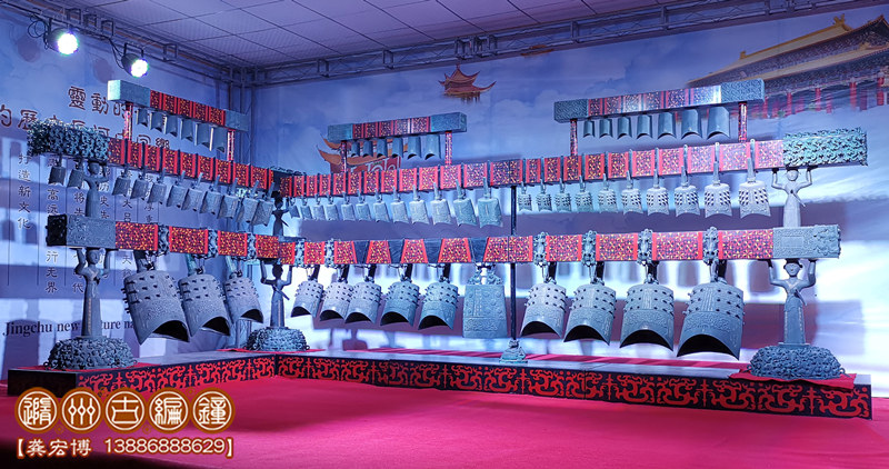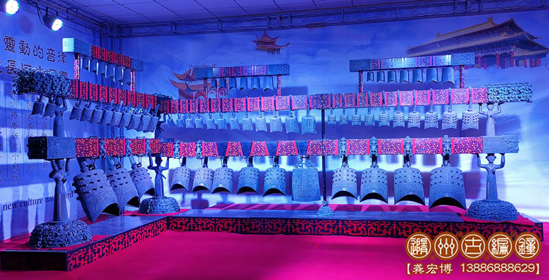 技術(shù)標準:鑄件要求紋飾清晰,表面光潔,無裂、刺、孔、糙等鑄造缺陷;整套編鐘音域5個八度,一鐘雙音,按國際標準A=440Hz調(diào)音,音準控制在±5Hz內(nèi),音色統(tǒng)一協(xié)調(diào),無雜、啞音響。其中下層13件為倍低音甬鐘,在演奏中起到烘托氣氛的作用,中層33件為中音域甬鐘,十二半音齊備,主要用于演奏主旋律,上層19件為被高音鐘和補音鐘,也是重要的半音和補充被高音音域,3組設(shè)計可以用于演奏復試旋律。其結(jié)構(gòu)、配件、銘文等全部按照曾侯乙編鐘樣式仿制。