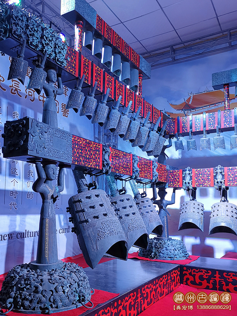 產(chǎn)品規(guī)格:長5.88米、寬3.2米、高2.5米。編鐘總個數(shù)為65個,采用一次成型失蠟法精密鑄造工藝制作。