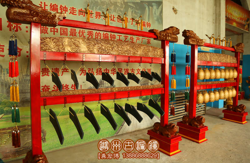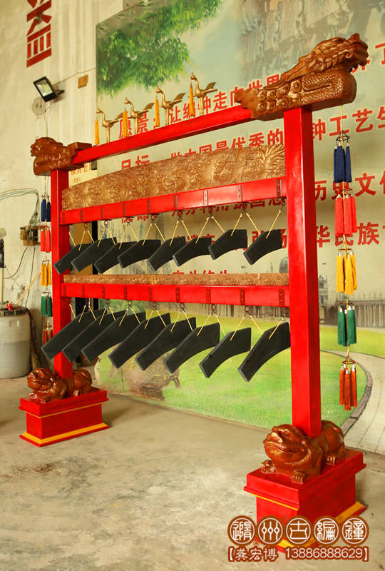 此套編鐘、編磬是根據(jù)清乾隆五十五年(1790年)【清金編鐘】、【清康熙五十四年石磬】而仿制的,因?yàn)榭蛻魰r(shí)間有限而未能做的完美。